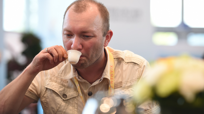 俄罗斯记者品尝福建茶叶(图片来源:中新社资料图)