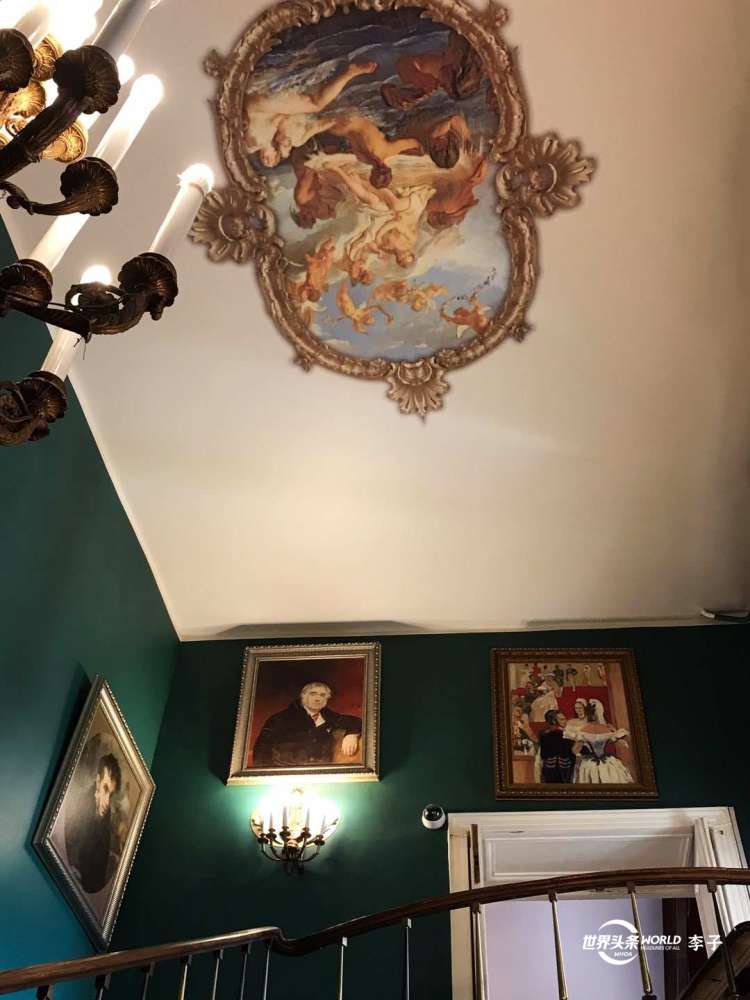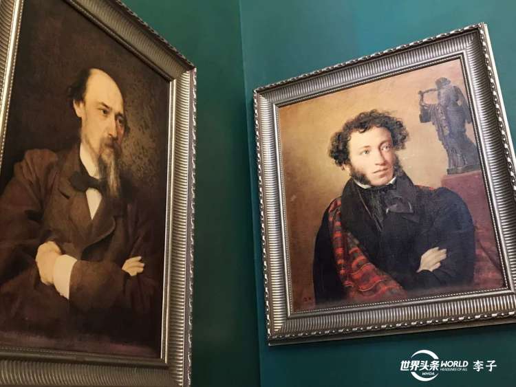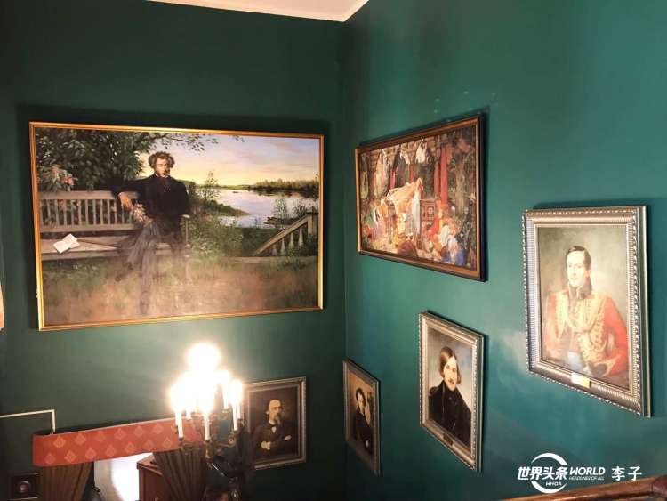 这里楼梯廊是皇家绿色的墙面,随着楼梯的走势依次悬挂着俄罗斯最著名的文学家画像:普希金、果戈里、莱蒙托夫、涅克拉索夫……诸男神在此集结,顺次排开,给到访的人们以文学氛围的渲染,艺术灵感的启迪。(见下图)