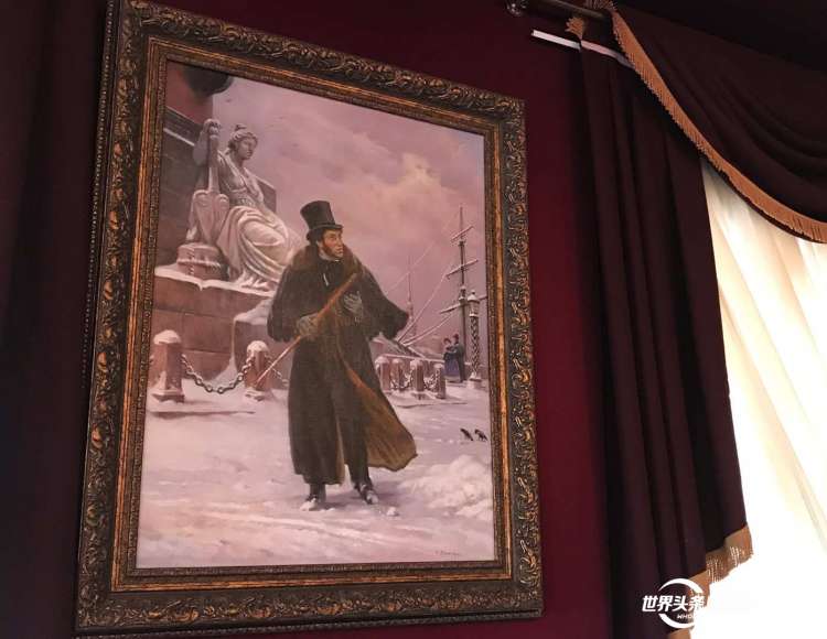 拾阶而上,到了二楼,这里前面的主色调是深红色,高贵典雅,厚重奢华,一派皇家风貌与格调。当然,主墙上,首先映入眼帘的是普希金全身画像,风雪中,他手里拿着宝剑,眺望远方,仿佛是在前往决斗的路上。(见下图)