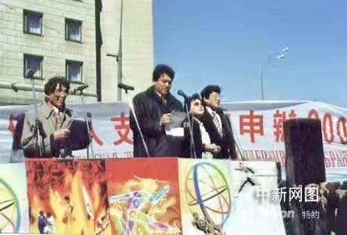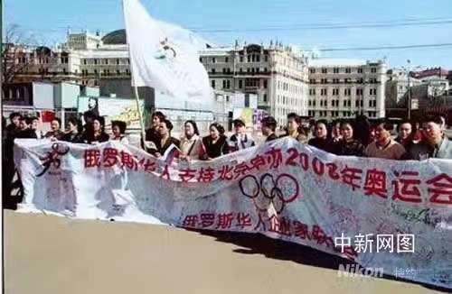 2001年夏,时任莫斯科华人华侨联合会会长的温锦华(上图,左二)等侨领率领旅俄侨胞在莫斯科红场为“2008北京申奥”助力加油!(图片来源:中新网)