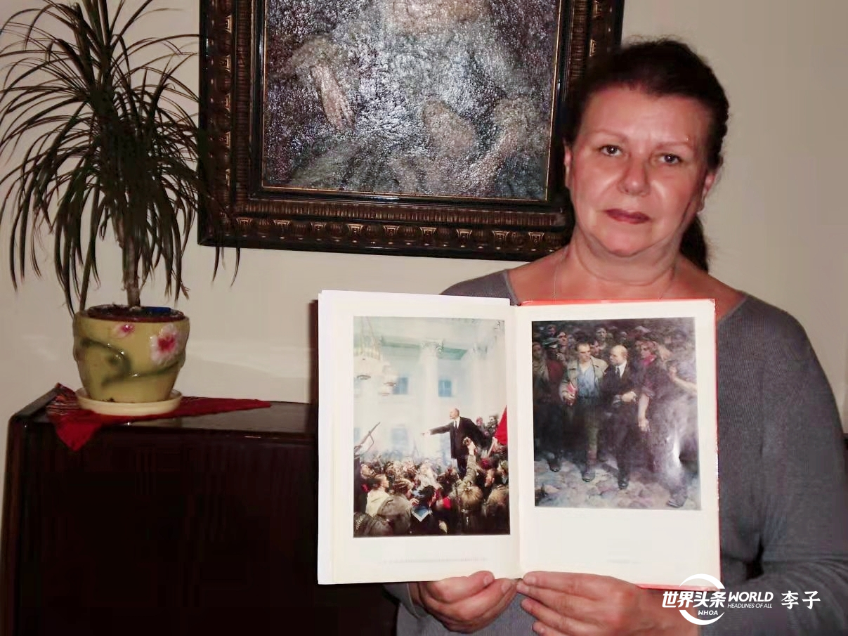 尼娜手持弗•谢洛夫的作品集,展示的页面是弗•谢洛夫的领袖题材代表作品。