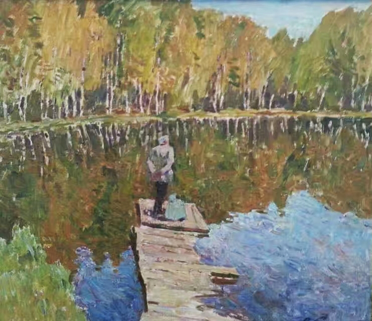 深秋,金色的树林和湛蓝的天空倒影在明静的水中,河岸将画面分成近乎相同的上下两半,一实一虚,亦真亦幻。虚实间,栈桥上,他身影如此伟岸……