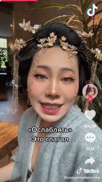 在TikTok上,杨歌以“无法忍受的俄语”为主题发布了很多视频,讲述自己学俄语的经历:一些奇怪的语法一直让她感到困惑。比如“‘kozel’(公山羊)和‘koza’(母山羊)是一种动物,两种性别,对吧?那么,请哪位受过教育的俄罗斯人来解释一下,为什么‘osel’(驴)和‘osa’(黄蜂)又成了两种动物?!”等等。