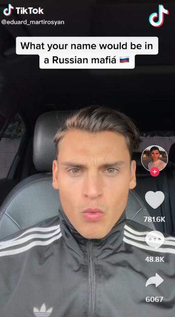 这个爱穿Adidas运动装的年轻人自称是亚美尼亚俄罗斯人,2010年12岁时移居美国。从2019年开始,Eduard Martirosyan开始在TikTok上介绍英语字母在俄语中的发音,以及一些受欢迎的美国人名在俄语中怎么发音,包括英语和俄语中一些奇怪的同音词,比如“fact”和“shield”在俄语中的发音有点像“f*cked”和“sh*t”。