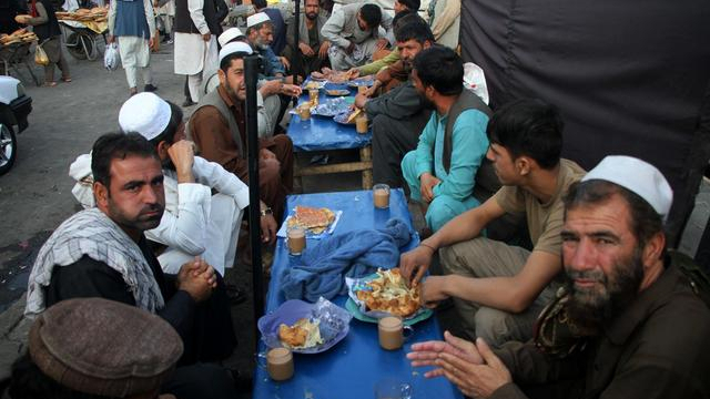9月15日,阿富汗民众在喀布尔街头吃早餐。(图片来源:新华社)