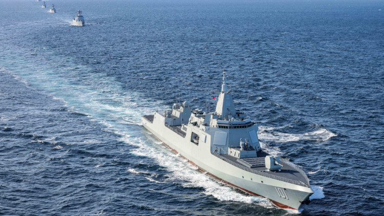当地时间10月15日,中俄“海上联合—2021”演习进入实兵演练阶段。图为海军101舰艇编队在联合机动。(图片来源:中新社)