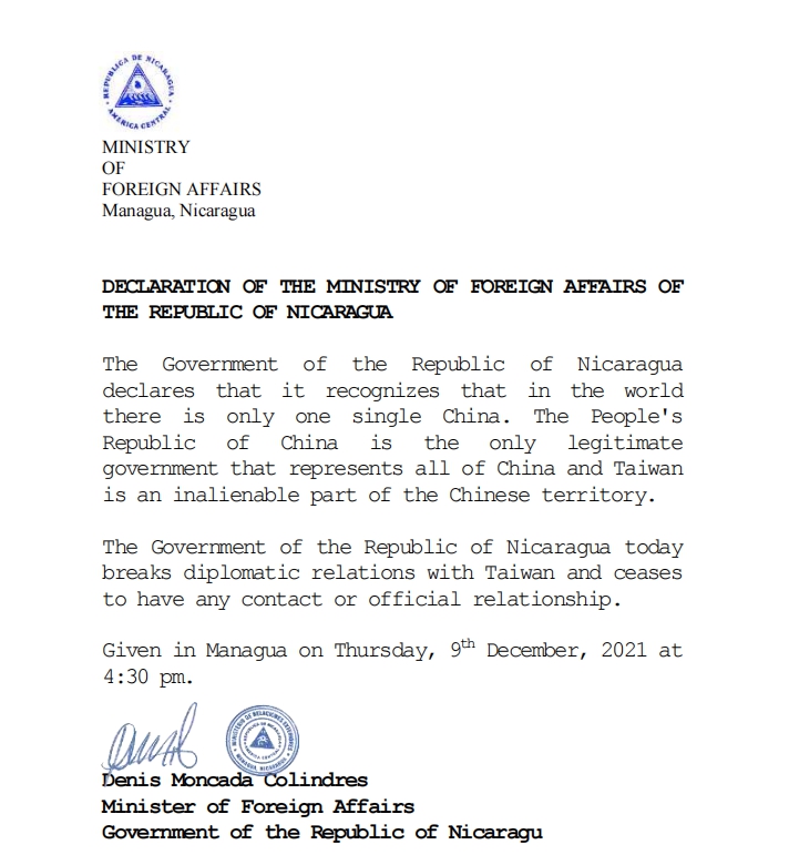 新华社报道,声明说,世界上只有一个中国,中华人民共和国是代表中国的唯一合法政府,台湾是中国领土不可分割的一部分。尼加拉瓜自即日起断绝与台湾的“外交关系”并停止与台湾的一切接触和官方联系。