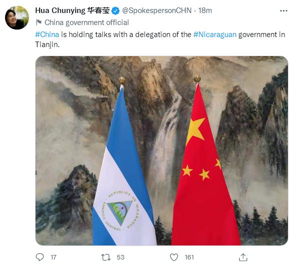 中国外交部部长助理华春莹10日在推特上透露:“中国同尼加拉瓜政府代表团正在天津举行会谈。”(图片来源:华春莹Twitter)