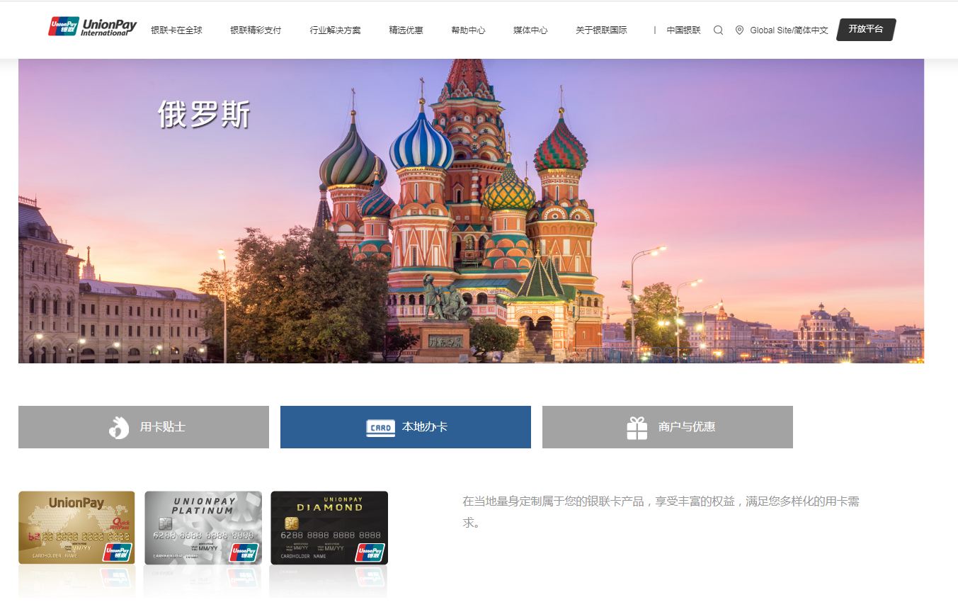银联国际俄罗斯频道。(图片来源:银联国际网页截图)