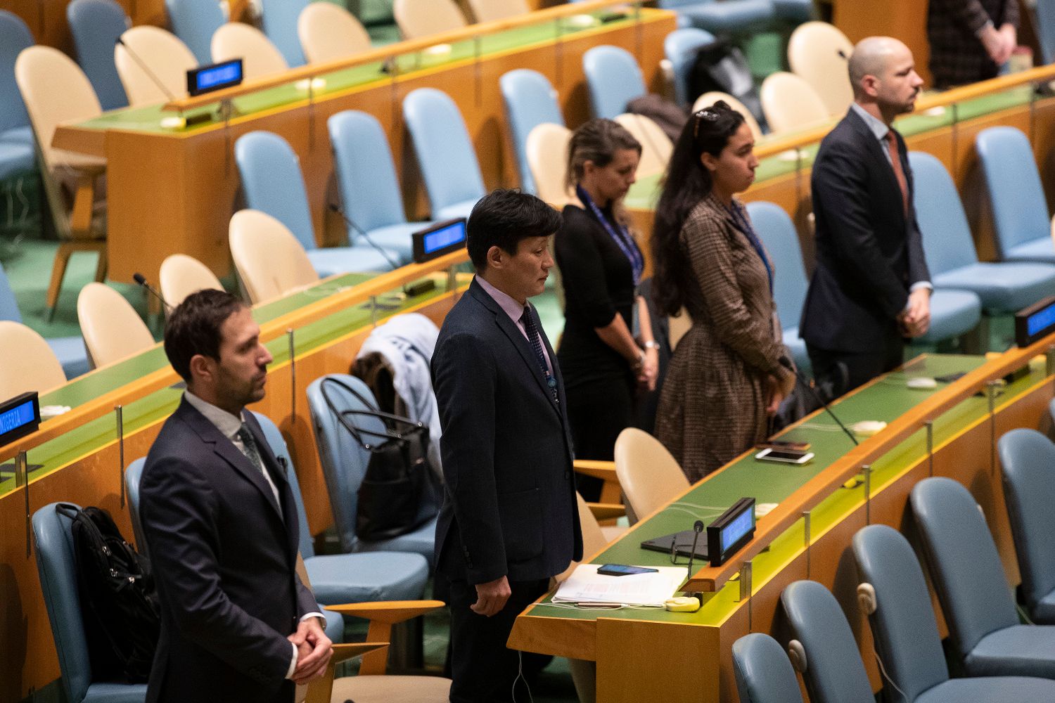12月1日,第77届联合国大会在纽约联合国总部举行体育促进发展与和平一般性辩论,会前联大主席克勒希主持默哀仪式,哀悼中国前国家主席江泽民逝世,各国代表起立默哀一分钟。(图片来源:中新社)
