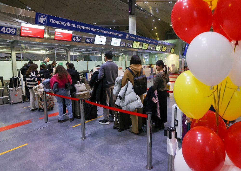 图为俄罗斯圣彼得堡,旅客在Pulkovo国际机场排队办理海南航空飞往中国北京的航班值机手续。(图片来源:CFP)