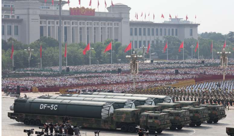 9月3日,纪念中国人民抗日战争暨世界反法西斯战争胜利80周年大会在北京隆重举行。图为核导弹第二方队“东风-5C”液体洲际战略核导弹驶过天安门广场。(图片来源:本文图片均据中新社)