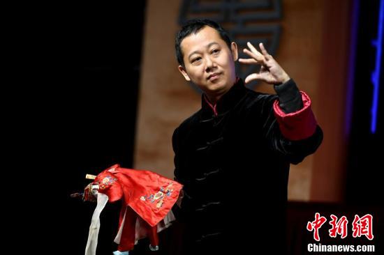 表演者介绍木偶戏指法。(王东明摄)