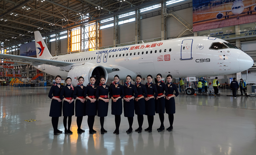 12月8日,东航空姐代表与C919大型客机合影。(图片来源:中新社)