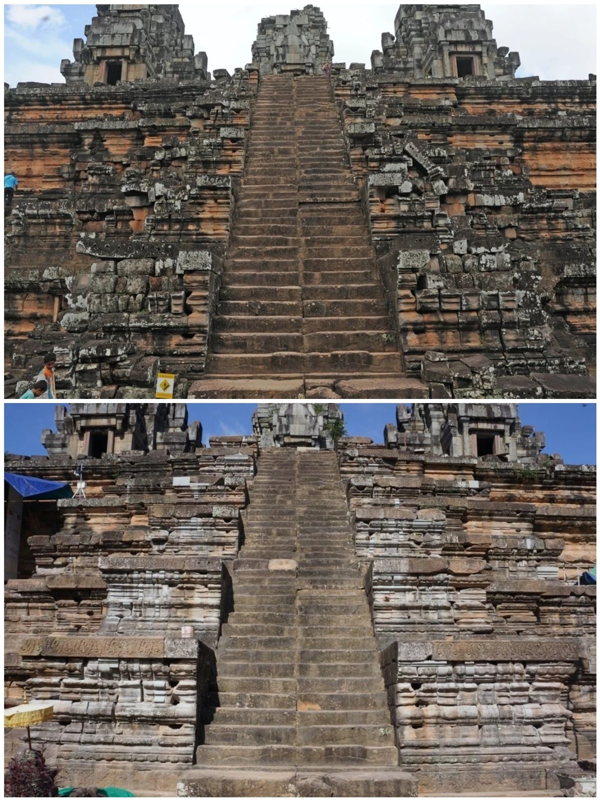 茶胶寺须弥台东踏道维修施工前后对比。 (中国文化遗产研究院供图)
