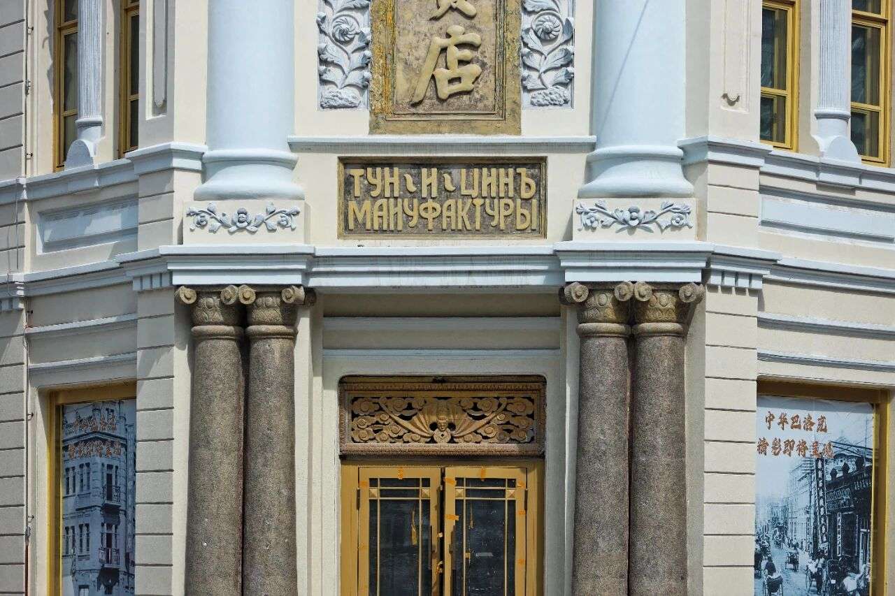 哈尔滨同义庆大楼转角处尽显中西融合的柱式与纹饰。