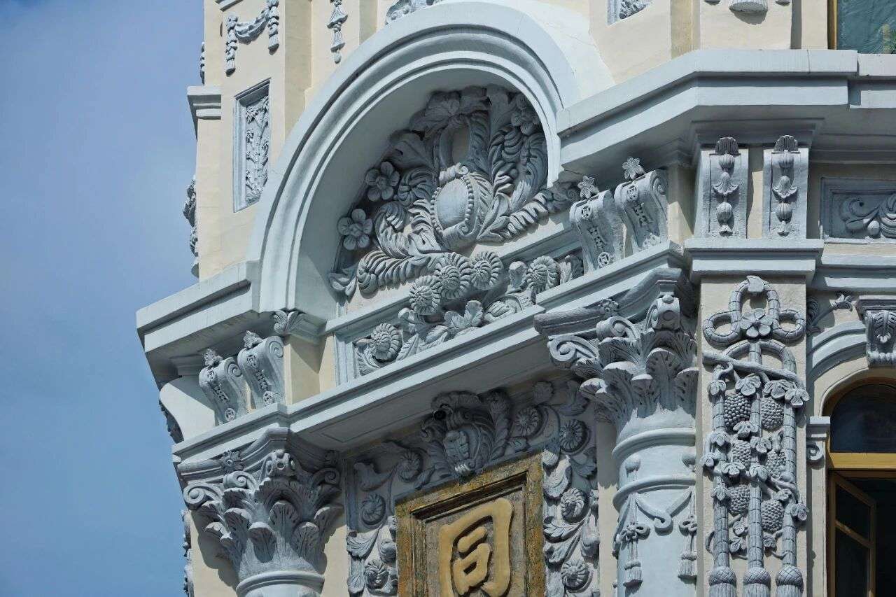 哈尔滨同义庆大楼转角处的拱券与菊花纹饰。