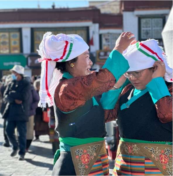 12月4日,拉萨大昭寺前信众整理着装拍照留念。(图片来源:中新社)