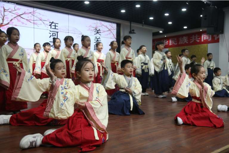2024年12月26日,河北省河间市第一实验小学学生在校内诗经馆吟诵《诗经》名篇《关雎》。