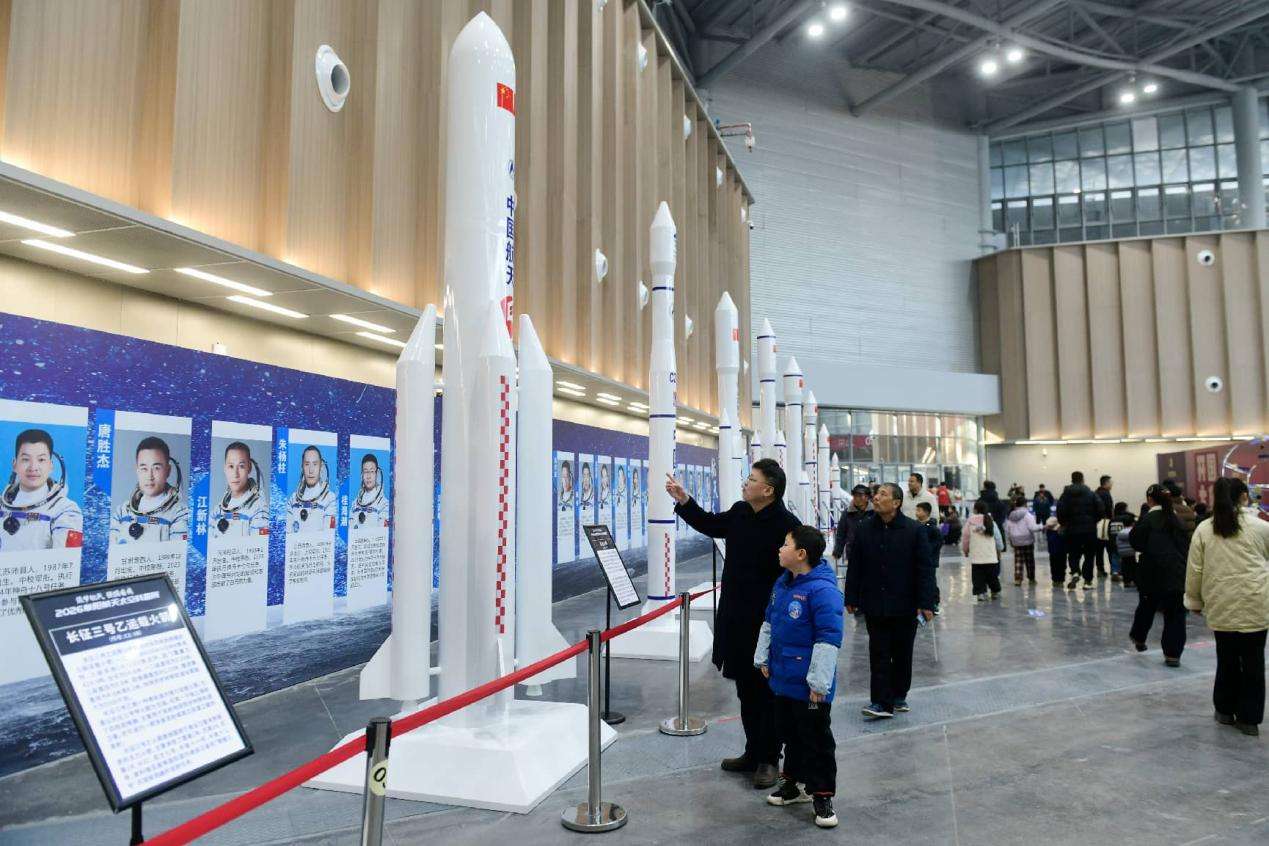 游客在安徽省阜阳航天太空科普展观看火箭模型。王彪 摄