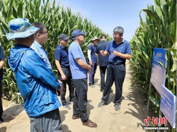 中国农业科学院西部农业研究中心专家李少昆(右)向农业农村部相关领导介绍试验示范田建设。(图片来源:薛军 摄)