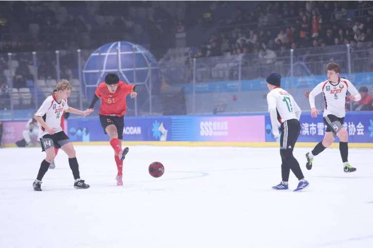 “冰超”2026第三届中国—上海合作组织冰雪体育示范区雪地足球比赛7日在哈尔滨冰球馆开赛。(图片来源:中新社)