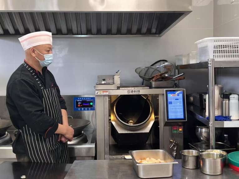 在一层智能餐厨区可以看到,通过点餐机器人可以快速查询每日菜谱,系统还可以根据个人身体状况推荐或排除部分菜品。洁净的玻璃窗后,炒菜机器人正在工作,根据系统内置的智能菜谱轻松烹制各色佳肴,调味配比能精确到克级。在付款区,结算机器人通过摄像头扫描菜品快速完成计价。送餐机器人灵活穿梭于餐区之间,精准完成配送。