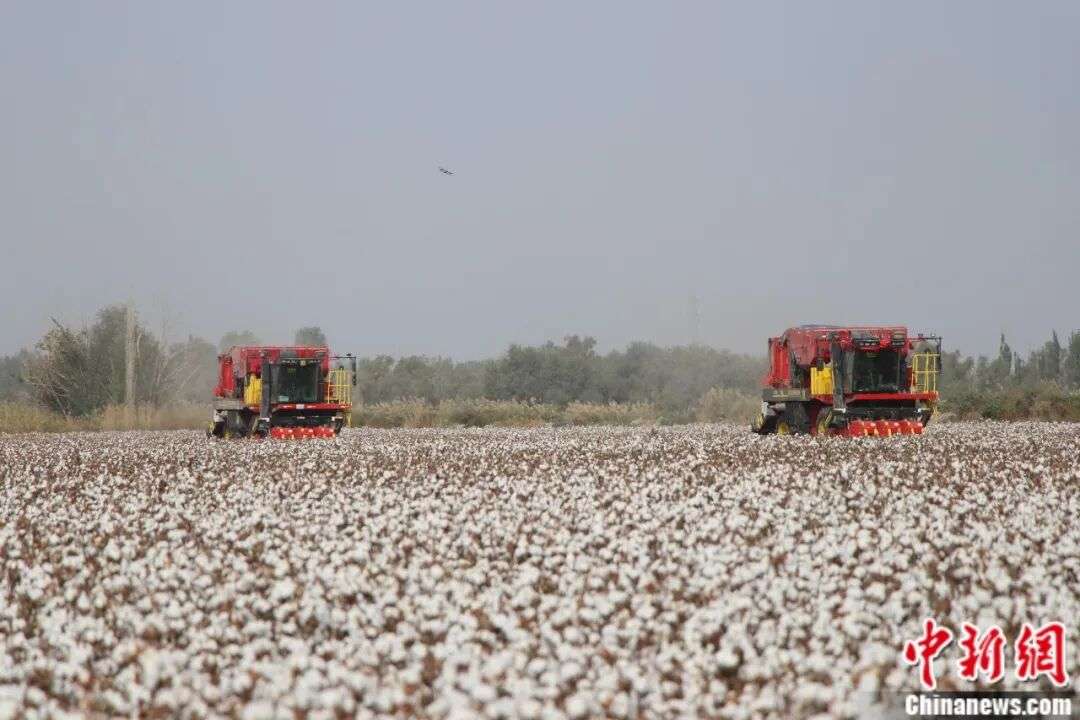 新疆巴音郭楞蒙古自治州尉犁县一处棉田内,大型采棉机正在作业。(图片来源:中新网)