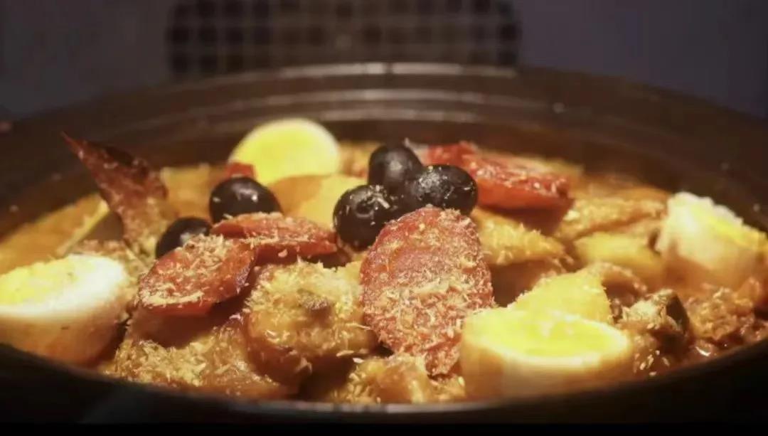 以澳门本地新鲜鸡肉为枝干,托举起跨越时空的精彩配料——葡式香肠、黑水榄远渡重洋来到东方。原产于印度的姜黄粉,跟随大航海时代的旅途在澳门落地生根。椰浆入菜,是16世纪从马六甲而来的饮食文化,再撒入一把椰丝,几经改良,丰富的口感带来浓郁的东南亚风韵。