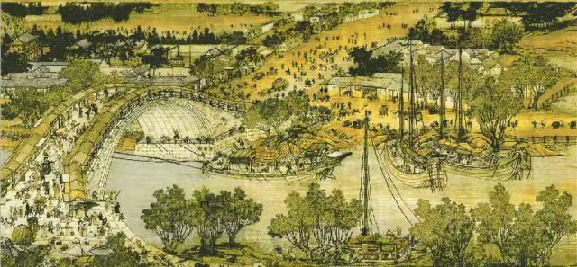 中国电视报道,画中有数百个人物,衣着不同,神态各异,出现最多的店铺就是酒肆茶馆。“水门向晚茶商闹,桥市通宵酒客行”生动形象地描绘了画中街市热闹繁荣的景象。