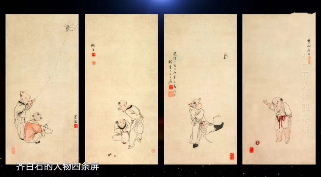 中国电视报道,齐白石是中国近现代绘画大师,擅长绘画花鸟、鱼虫、山水、人物。他的笔墨雄浑滋润,色彩浓艳明快,造型简练生动。齐白石的人物四条屏,绘制于1897年,共包含《放风筝》《玩铜钱》《踢毽子》《拍球》四幅作品。纸本淡着色,采用了民间人物画的传统形式,刻画了四组嬉闹游戏的孩童,从中可以看出齐白石用笔稚拙老辣,内含削金刻石之劲。