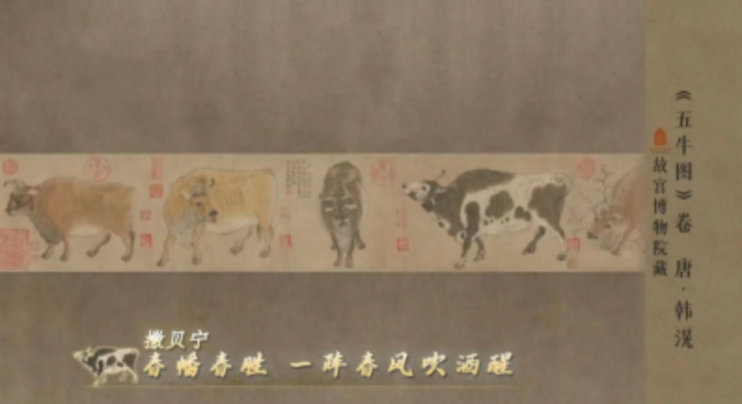 中国电视报道,《五牛图》是中国唐代画家韩滉(约公元8世纪)所作,是中国历史上着名的绘牛画作,纵20.8厘米,横139.8厘米。《五牛图》中五牛姿态各异,或行或立,或俯首,或昂头,描绘出倔强执着、意气风发、大方公正、俏皮可爱、意态悠闲等不同的形象。韩滉用简洁有力的线条勾勒出牛的骨骼转折,连牛头部与口鼻处的根根细毛都是笔笔入微。双双牛眼,炯炯有神,生命感和力量感徜徉其间,笔法精湛为人称道。