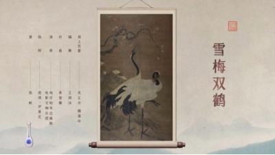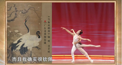 中国电视报道,《雪梅双鹤图》轴,由中国明代边景昭(公元14-15世纪)创作,纵156cm,横91cm,现藏于中国的广东省博物馆。鹤立,是独步天下的东方灵韵,一路伴随远古文明至今。中国人自然地为鹤冠以“仙”的形容,称其为仙鹤,它出现在春秋时期(公元前770—公元前476年)的莲鹤方壶上,展翅欲飞,驱陈纳新;它出现在诗中,有排云上碧霄、东飞过沧海的诗情;出现在画中,带来仙音袅袅、高雅灵动的画意。中国古人把修身洁行而有时誉的人称为“鹤鸣之士”;舞蹈中,有一种翩跹优雅的舞姿被称为“鹤立式”。