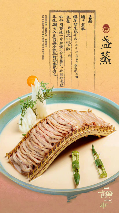 中国电视报道,盏蒸的摆盘采用《清明上河图》中“虹桥”的样式,“桥头车马喧嚣阗,桥下帆船见画船”,盘中由巨木搭建的虹桥承载了中国宋代(960年-1279年)熙熙攘攘的开封生活。软嫩可口的蒸羊里融汇了中国历史上宋代文人墨客的风云押韵。在宋代人们认为一道精致的菜肴不需要用什么山珍海味,而是简单的羊肉即可制成,正所谓“大道至简”。