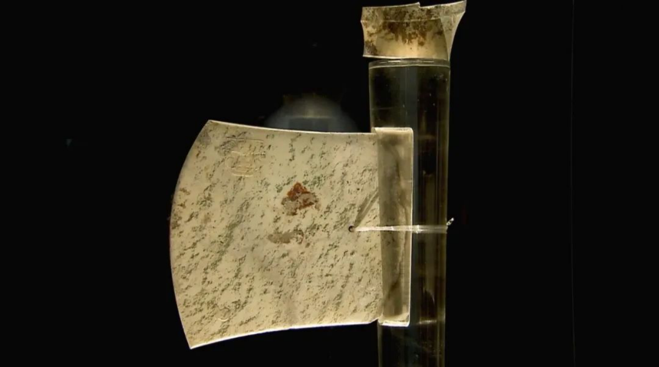 这件玉琮高约8.9厘米、重约6.5公斤,是迄今发现最为宽大、造型及图案最为典型的史前玉琮,因而被称为“玉琮王”。和玉琮王同时出土的,还有一件大型玉钺(yuè),因其制作精美,也被称为“玉钺王”。这两件重器出自同一墓穴,在目前发掘的良渚墓葬中规格最高。