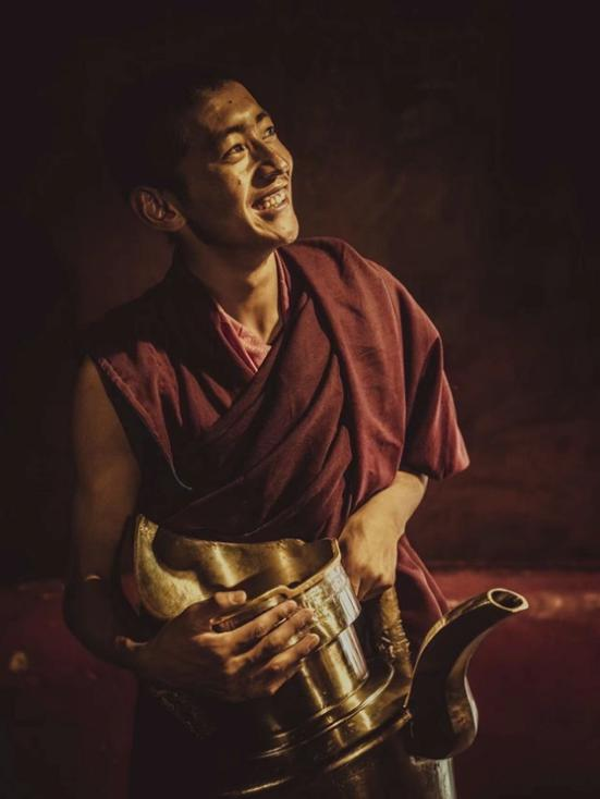 扎什伦布寺经历过劫难,也经历过辉煌,甚至七世班禅时期的扎寺,与现在的规模差别不大。是怎样的坚守,能够沉淀出这样的生存智慧。我还记得,我们在扎寺拍僧人辩经的场景,无论我们的机位如何转换,无论摄影师怎么在场中跑来跑去,丝毫不影响他们的状态,他们仿佛完全看不到摄像师的存在,忘我地沉浸在对佛法的思辩之中。中场休息的时候,有个年轻的僧人出来去厨房里熬茶,看到我们满头大汗的摄影老师,便笑了笑,从他的僧袍里拿出一根香蕉,说,“你们辛苦了。”这个小小的举动,我们被感动了。摄影师反应很快,拿起包里的相机,立马给他拍了张照片。他手提金色茶壶,灿烂地笑着。嘴角的阳光和喜悦与他棕红色的僧袍互相映衬。这,不就是新时代僧人最好的面貌吗。于是那天我们把这张照片定格为我们画面所要呈现的风格——“卡拉瓦乔式的油画般质感”。