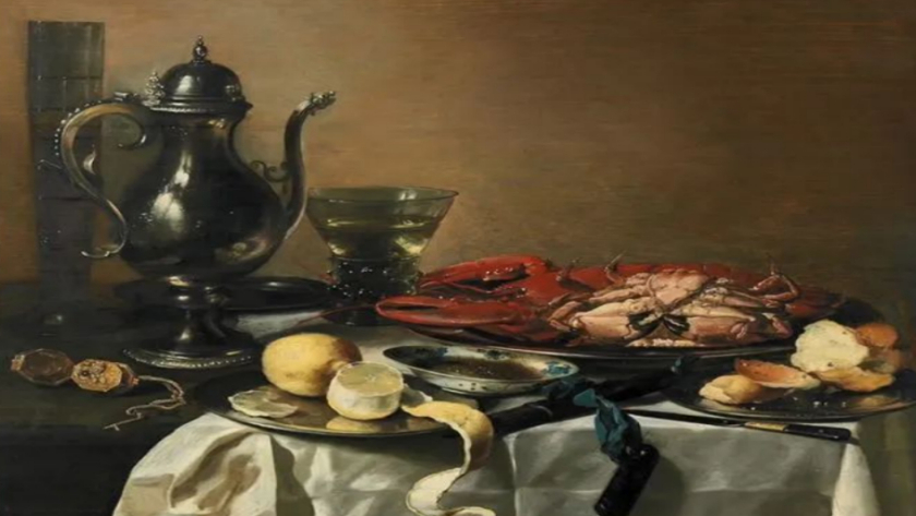 而这与西方静物画家彼得•克拉斯笔下的感觉完全不同——餐盘中的螃蟹和龙虾显现出一种“死亡的静穆”。受到荷兰“黄金时代”社会风潮的影响,彼得•克拉斯笔下的静物以“象征”的手法,隐喻生命脆弱短暂,暗含着生与死的哲学思考。
