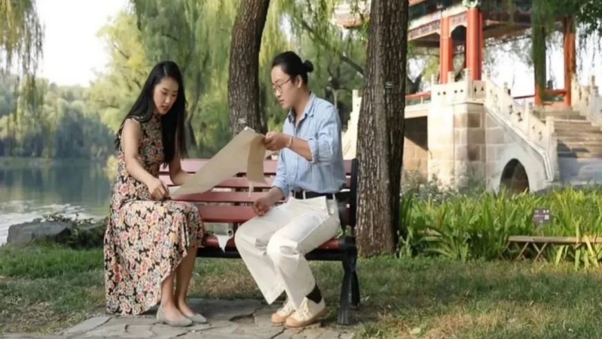 主持人与嘉宾在户外赏画