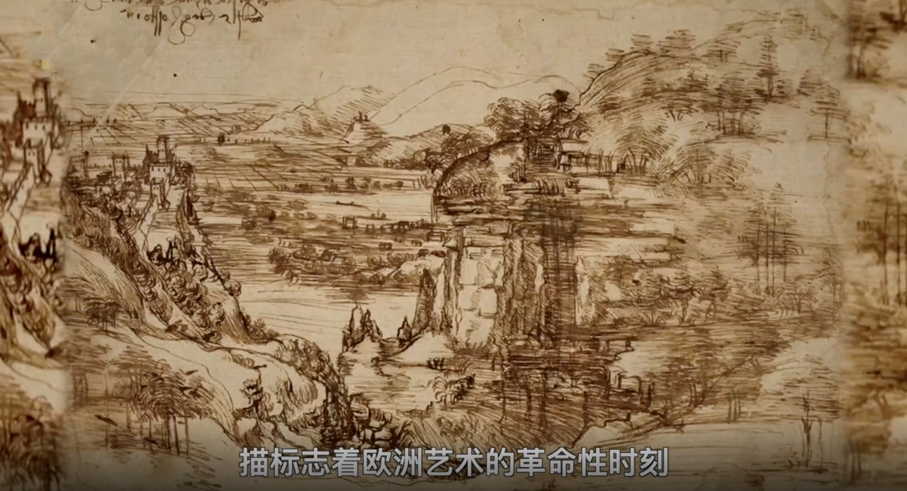一位雄心勃勃的年轻艺术家决定画出托斯卡纳的美丽风光,而他在画作中仅仅描绘高山树木等自然风光,这是前所未有的。这幅素描标志着欧洲艺术的革命性时刻。这位画家就是后来的艺术巨擘达•芬奇。对比中国明代(公元1368年―公元1644年)著名画家之一唐寅所画的山水画《湖山一览图》,画中山水相映,可以看到地平线。由于采用了挂轴的形式,因此有多个透视角度。中国画作更强调写意,画中留白给观者提供了极大的想象空间,而西方画家则努力重现他们所看到的真实景象。