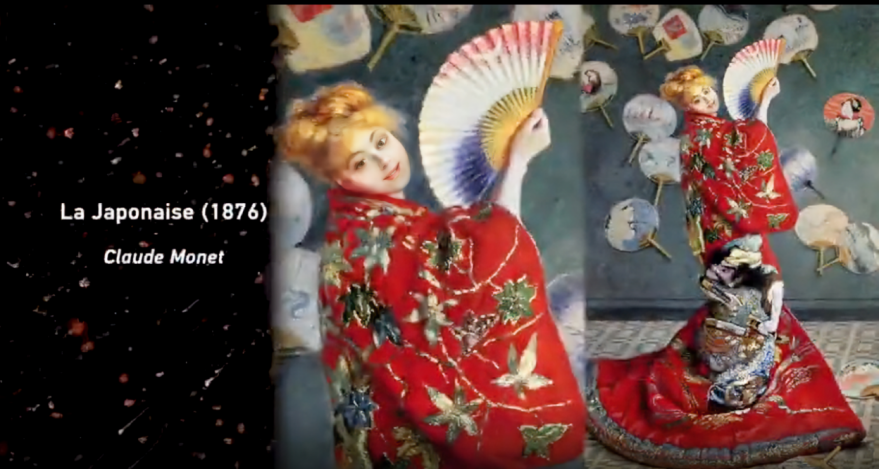 1867年,日本工艺品在巴黎世界博览会上展出后,欧洲掀起了一股“东方热”。身着和服、极富东方元素的女性画成为了当时艺术界的时尚。西方印象派代表人物法国画家莫奈从未去过日本,却也紧跟潮流,在他位于吉维尼的家中,到处都摆满了日本木版画,还为自己妻子创作了一幅肖像画。