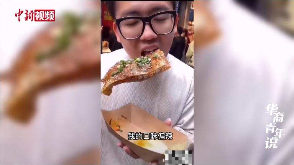 Nicola Jiang品尝街头小吃。(图片来源:中新视频)