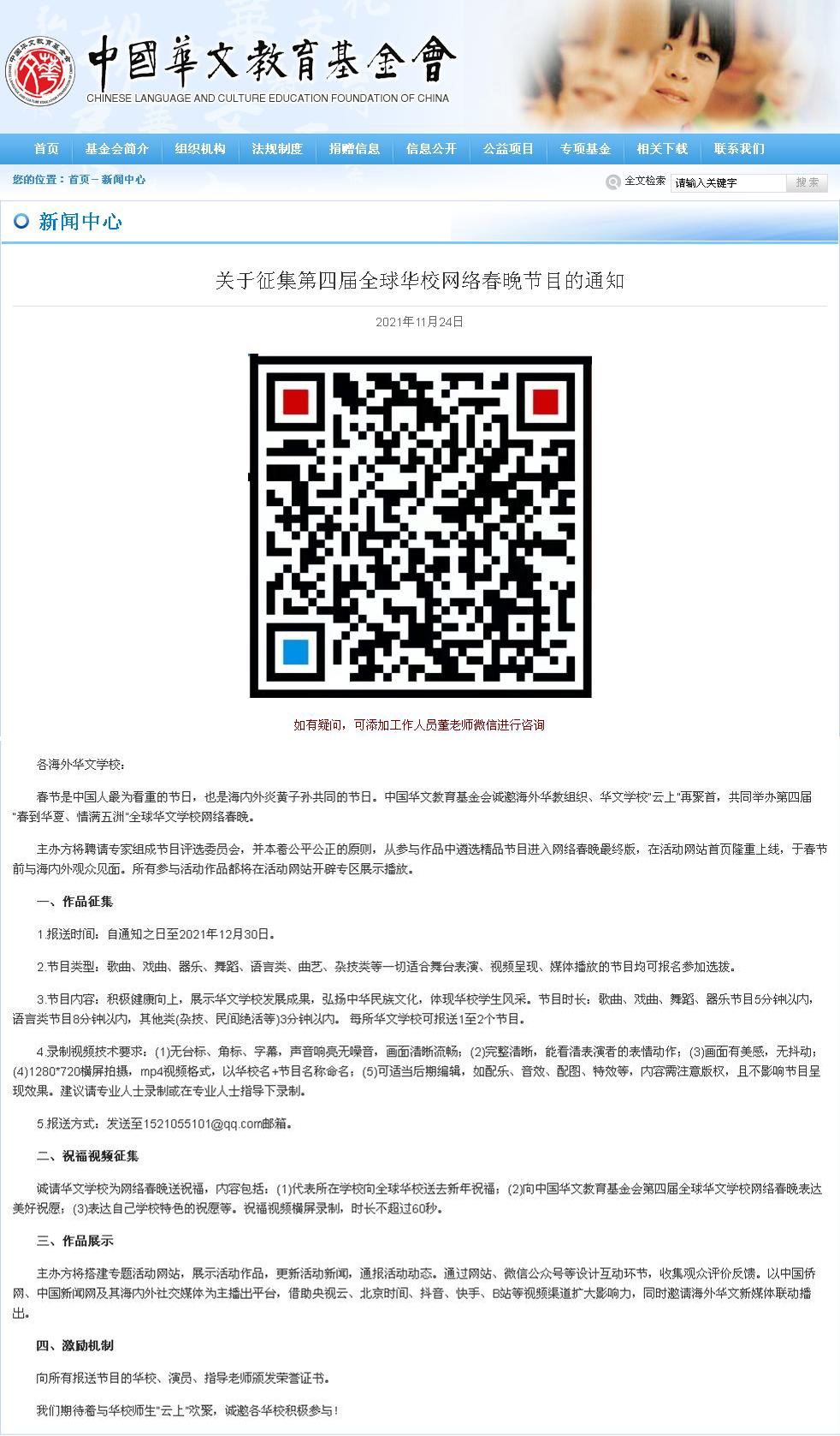 中国华文教育基金会24日发出向海外华教组织、华文学校征集第四届全球华校网络春晚节目的启事。