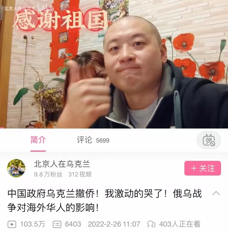 撤离紧急通知发布后,孙光26日在B站上传了一段拍摄于24日的视频表示,感谢祖国所做的一切,他在24日晚7时已收到撤侨相关信息,“如果没有中国政府安排的撤侨包机,乌克兰华人们回家难比登天”。