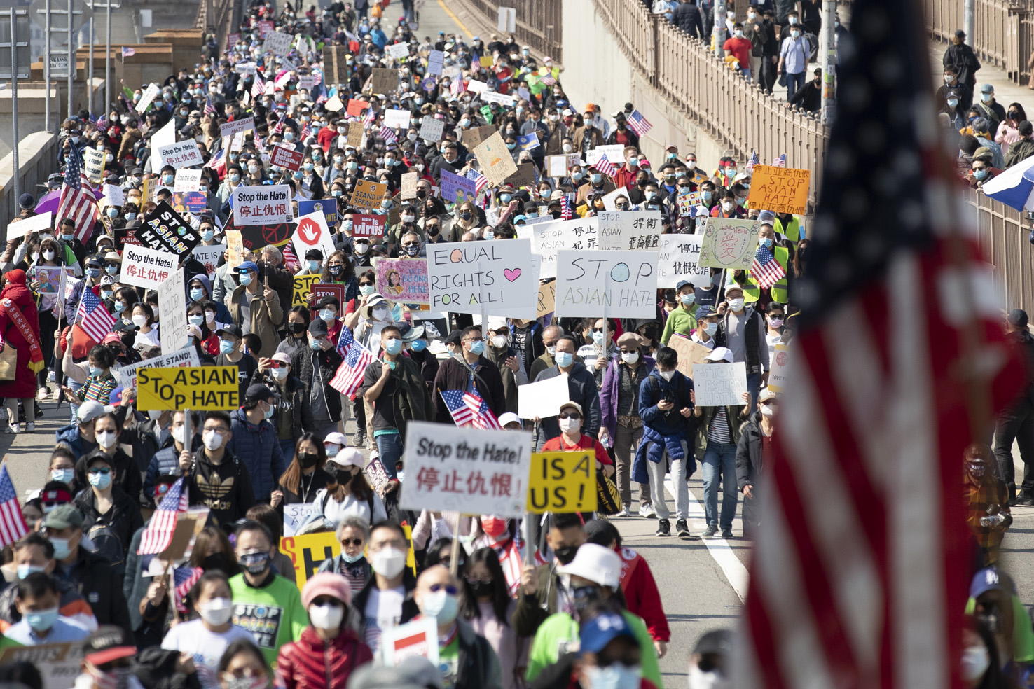 2021年4月,上万民众在纽约举行反仇恨亚裔大游行。(图片来源:中新社)