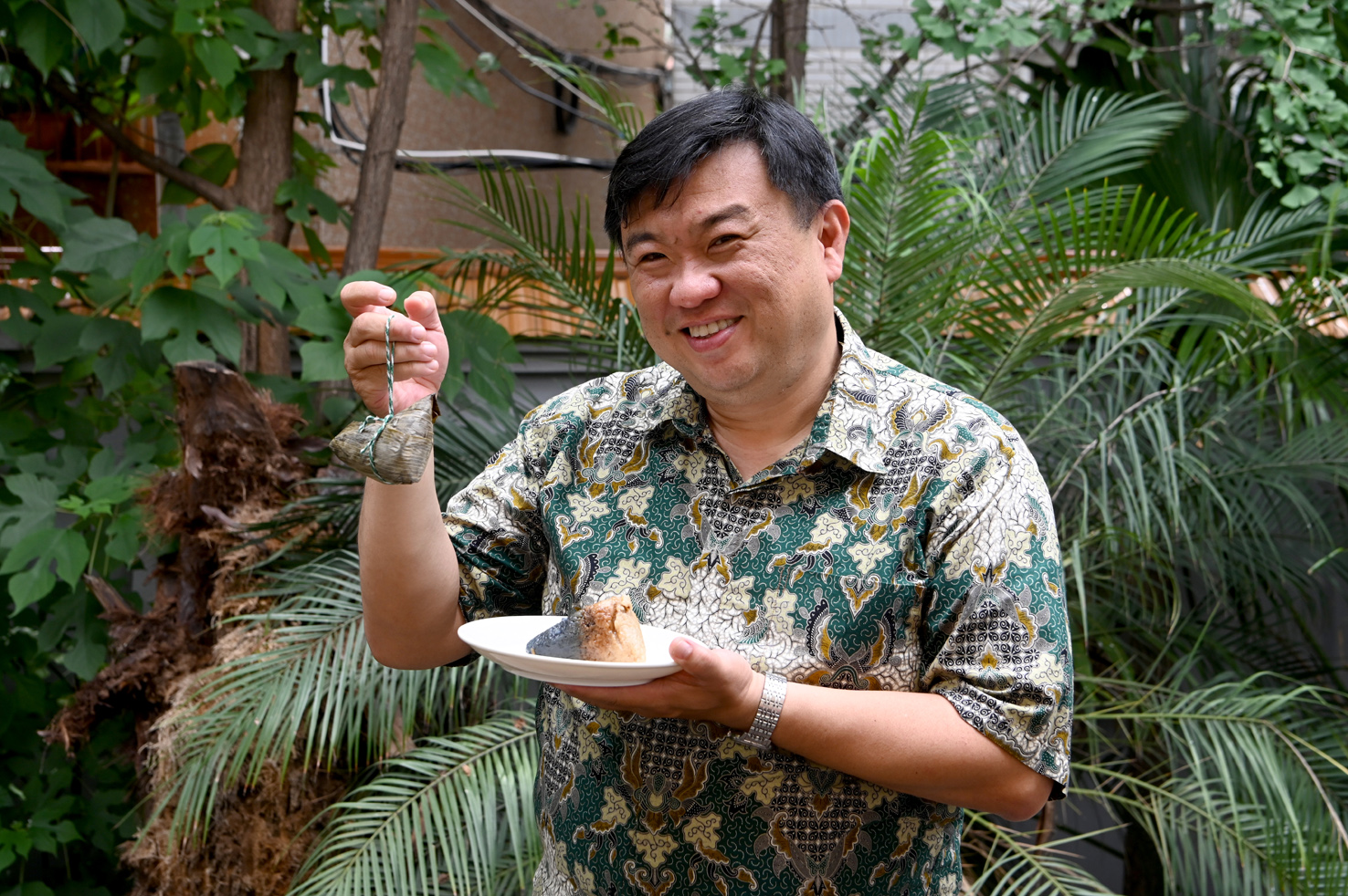 6月1日,在云南昆明翠湖旁,马来西亚华人温贵新展示娘惹粽。他表示,希望以美食为媒,促进马滇两地的民间交流和民心相通。(图片来源:中新社)