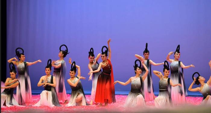 中新社报道,追光落下,裙摆摇曳,勾勒出一道道圆润的弧度。霓裳羽衣舞的飘逸柔美、胡旋舞的轻盈欢快随着音乐韵律组成了一首诗,带领海外观众穿越到中国的盛唐时代,体验不一样的裙袂飘飘和唐风古韵。