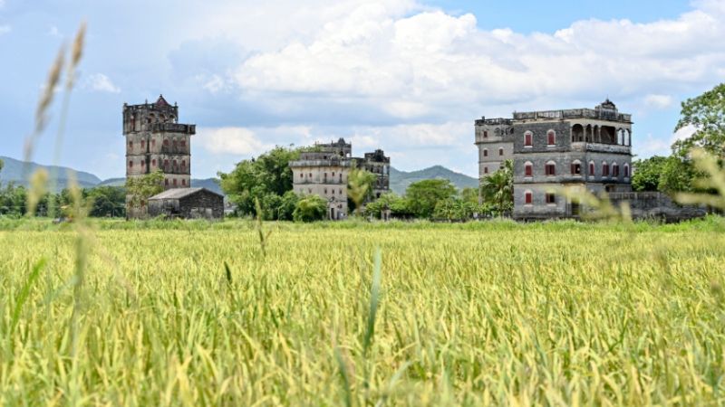 开平自力村的碉楼群以建筑精美、布局和谐闻名,古榕树、荷塘、稻田与四周的碉楼、民居相映成趣。