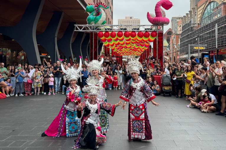 2月21日,悉尼市中心户外广场上,悉尼华星艺术团成员带来民族歌舞表演,吸引众多当地民众驻足观看。(图片来源:中新社/受访者供图)