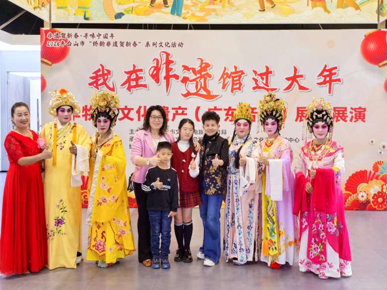 2月18日,委内瑞拉委中贸易商会副会长胡敏仪(左四)带家人到台山市非物质文化遗产展示馆内观看演出后与演员们合影。