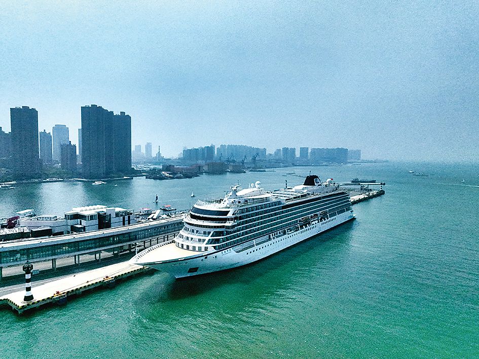 图为“蓝梦之歌”号(左)和“招商伊敦”号在青岛邮轮母港同时停靠。